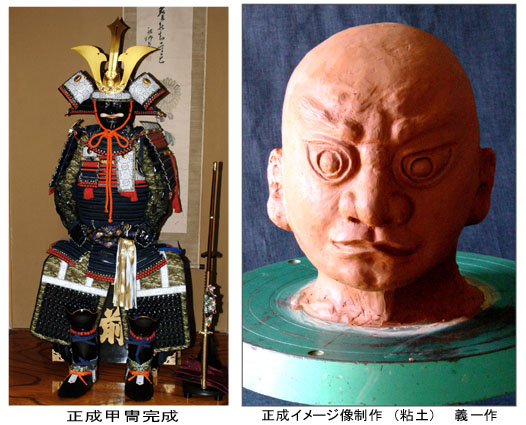 | 時代考証を済ませ発注しておいた甲冑が届きました。いよいよ正成像本体の制作に取りかかりました。まず粘土でイメージ像を作ります。先代正成像の面の部分が微かに保存してあったので、これに肉付けしたイメージで作りました。このイメージ像は一日半で作り上げました。どんなに短期間で作り上げたものでも、集中した時間を過ごすと、「これでよし。」と満足してしまうものです。しばらくの期間見ているとその作品の欠点や改良点が見えてきます。それから本制作の木彫に入ります。甲冑の大きさから割り出すと、およそ身長185cmくらいの正成像になります。何百年も残るものですから、精神的にエキサイトしがちになるものですが、冷静に静かな心で制作にあたりたいと思います。 |