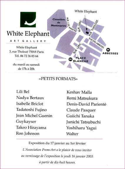 | 1月17日より2月1日迄、PARIS ART GALLRY White Elehant に於いて、国内外アーチストによる作品展が開かれています。White Elehant はパリ在住の原田 宏氏がプロジュースしているGALLRYです。原田氏は35年前にフランスに渡りパリに永住した深谷市出身の私と同郷の画家です。菅井 汲とも交友があり国内外で2人展も開いていました。菅井 汲が亡くなった後も、浜松の画廊で2人展を開きました。原田氏に「思想の違う外国人に作品を批評してもらうことは、これからの創作活動に意味のあることです。」 と勧められてパリ展に出品することになりました。木口版画を数点出品しましたが、ヨーロッパの人たちに、どの様に受け止められるが楽しみです。私は仕事の都合で26日に出発します。 |
