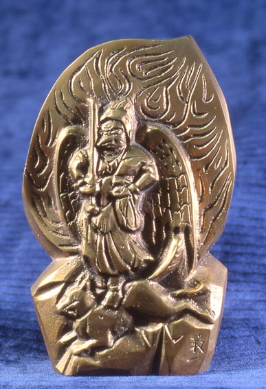 分家に96歳になる松五郎というおじいさんがおります。高尾山の講元を努めておりました。講元を努めて20周年記念に、この鋳造作品を作りました。講員300人に記念品として配布しました。松五郎80歳の時でした。出来上がった「烏天狗」の像を見て、「このくらいならオレにも出来そうだ。教えろ。」と言うのです。百姓一筋に生きてきた80歳のおじいさんが、鍬をノミに持ち替えても完成しないだろうと思っていました。意欲の他に信仰心が後押ししたのです。完成させました。身長40cmの像は開眼して庭のお堂に祀ってあります。松五郎いまだ現役の百姓で「深谷ネギ」作りの名人です。