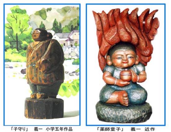 誰にでも大切な宝物が一つや二つあるものです。小学校五年生のとき末の妹が生まれました。母が妹を子守りしている様子を、肥後の守(折り畳みの小刀)一本で彫りました。高さ9.5cmの小さな像です。私にとっての宝物はこの「子守り人形」です。「子守り人形」と今まで制作した彫刻作品を比較して見ると、人間が持っている感性は変化しないような気がします。感性は少年期に完成してしまうものなのでしょうか。現在、私の作る作品のほとんどはズングリしたものです。「子守り人形」と最近作った「薬師童子」は作風が殆ど変わっていないのです。不思議ですネ。