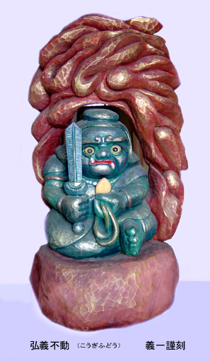 「米を増産せよ」「減反し野菜に切り替えよ」「動物性蛋白が必要、酪農推進が急務」と国の農業政策に翻弄されながらも、昭和20年代から酪農一筋に生きた人がいます。乳牛飼育のかたわら、親鳥から迷った「子ひばり」や「稚児のうぐいす」を育て野に放ってやる動物好きの人です。ですから牛乳の価格が極端に下落したときでも、酪農の仕事を辞めようとしませんでした。家業としてと言うより乳牛そのものが好きだったのです。しかし、夫婦で40数年間営んできた酪農を辞めることにしました。これを記念して作ったのが「弘義不動」です。彼は弘法太子様を信仰していたので、太子の「弘」と本人の名の「義」をとって「弘義不動」と名付けました。