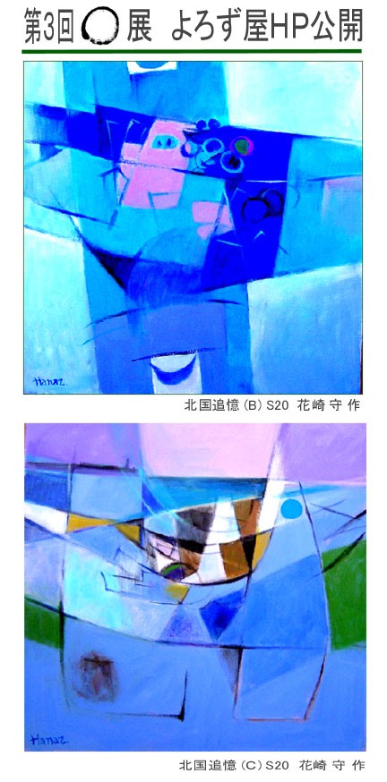 〇の会」です。〇は、「ゼロ」であり、「無」であり、「空」でもあります。また、宇宙をあらわす空間概念でもあります。創作の原点を〇・ゼロに求めて結成したのが『芸術集団・〇の会』です。再出発して三回展を、6日から8日迄開催しました。今回は特に「よろず屋・・・・・」のHPをご覧頂いて、近県から8名の方に参観頂きました。展示した会員の作品を紹介します。