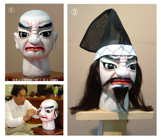 正成像制作が軌道にのった先週あたりから、制作への協力者が出ていました。鎧下に着る小袖と大口袴は、石井長慶先生の奥様とご親戚の方が作ってくださいます。生地は長慶先生が愛蔵していた民芸的にも価値のある白無垢を提供して頂きました。「百年後、二百年後の人たちがこの小袖や大口袴を見ても恥ずかしくないものを作ります。」と長慶先生の奥様。身体の骨組み作りは除村工務店が、肉付けに使用するパットは洋裁が堪能な写真店の奥様が協力していただけます。これからの私は、それぞれの作業をプロジュースするだけの仕事です。頭の制作は12日にほぼ完成しました。3・4日見ていますと、また欠点が見えてくるものです。最終的の仕上げはそれからです。頭彩色の手順は添付の写真を参照ください。