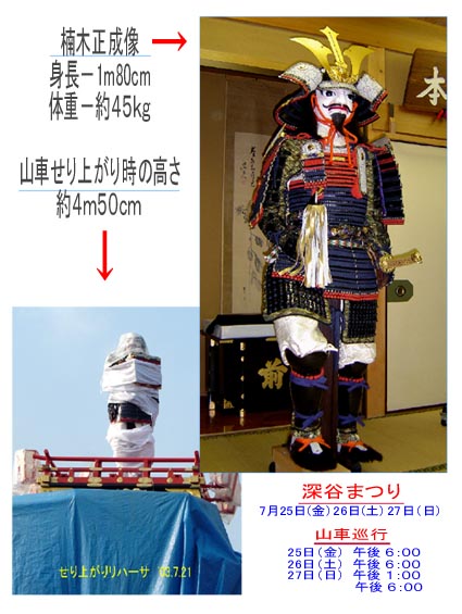 今日25日から深谷まつりがスタートします。21日に正成は正装して、山車のせり上がりリハーサルに臨みました。大成功です。甲冑着用には手順があります。@浴衣を付け小袖を着る。A大口袴をはく。B乱髪にして鉢巻きをする。C弓掛けを付ける。左右のあるものはいずれも左より付ける。D直垂を着る。Eすね当てを付ける。Fつらぬき(靴)をはく。G籠手を付ける。H脇楯を付ける。I鎧を付ける。J脇差しを差す。K太刀を付ける。およそ以上のような手順で着付けをしました。着付けの手伝いをする家来は鎧を付けた正装でしました。山車人形の着付けもこのような手順で行いました。正装した正成を山車に据え付け,せり上がりのリハーサルをして出陣準備完了です。