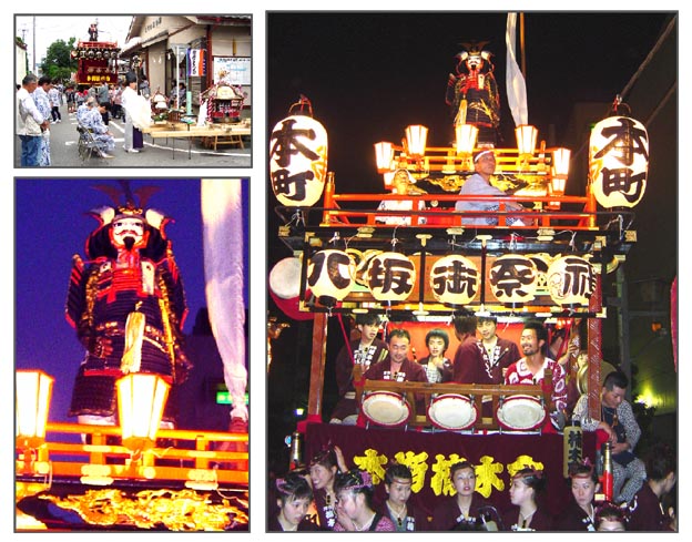 7月26日午前10時30分入魂の儀・三乾の儀を執り行い、正成いよいよ出陣です。町内巡行の後、午後7時駅前広場に各町内の山車と屋台11機が集合。まつりが最高調に達しました。深谷囃子は「暴れ囃子」と言われています。11機から打ち出される囃子は周りのビルに反射して夜空を駈け巡ります。2時間あまりの叩き合いを済ませて、各町内の仮宮に曳き帰りますが、交差点で他の屋台に出会うと、またそこで叩き合いです。午後10時引き返した会所には「なおらい」の席が用意され鋭気を養い明日に備えます。あと1日です。