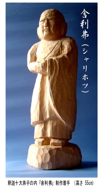 今年は棟方志功生誕100周年です。8月24日の日曜美術館でも志功特集が放送されました。ベネチア・ビエンナーレで大賞を得た釈迦十大弟子(板画)に魅せられて、十大弟子を彫っておこうと決めました。仏像事典(東京堂出版)によると「・・・・その姿だけから尊名を決めることは難しい。」とあります。これと決まった形はないらしいのです。これは制作にあたって好都合です。自分の解釈で彫っていけばいいのですから・・・・・。尊名から最初に目に付いたのが「舎利弗・シャリホツ」です。般若心経の中で「舎利子」と唱えるところが何回かありますが、この「舎利子」は釈尊が「シャリホツよ・・・・・」と弟子の舎利弗に呼びかけた言葉だそうです。経典の中にでてくるくらい釈尊に信頼されていたお弟子さんでした。はじめにこの「舎利弗」から制作にかかります。8月30日.31日の二日間の作業でおよその形を彫りだしておきました。次回配信日までには完成させます。10体完成まで一年かかるかな。一年では無理かな。気まぐれな性格だから・・・・。