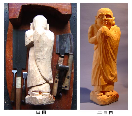 未完成ながら舎利弗と阿難の二人を彫ってみましたら、三人目を並べてみたくなりました。多分三人目を彫ると四人並べてみたくなると思いますので、計画を変え取りあえず十大弟子全員を彫り出すことにしました。全員が集合した後徐々に仕上げていきます。三人目は優波離(ユハリ)です。一日目は鋸と鉈をが中心の作業です。大ざっぱな仕事ですが神経を一番使うときです。二日目にはって顔の表情を付け、各部を彫りだしていきます。次回配信日には木連(モクレン)仲間入りさせます。〔9月8日記〕