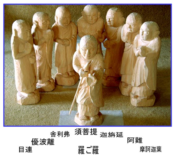 | ここ二十日間あまりで釈尊十大弟子の内、粗彫り八人が生まれました。仕事場で未完成ながら数人の作品をみていると、仕事を止めるわけにはいかなくなります。休息をとるためには外出してしまうより仕方がありません。そこで先日は信州の石仏に会いに行って来ました。秋の石仏に会ったので、十大弟子の制作にも勢いが増しました。今、1日八時間労働で、一人の制作に二日のペースで進んでいます。粗彫り十人が完成した後、釈尊像を彫ります。粗彫りでも目標達成までの見通しがついてくると嬉しいもんです。(9月15日記) |