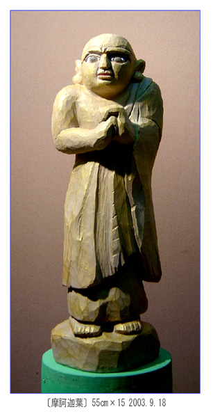 市内国済禅寺のお坊さんから「釈尊と十大弟子」というタイトルの本を頂きました。摩訶迦葉(マカカショウ)の項を拾い読みしてみました。摩訶迦葉は釈尊に出会って八日目には悟りをひらいて阿羅漢(聖者)となったそうです。出家後まもなくのころ、自分の上衣を四つにたたんで、その上に釈尊に据わって頂きました。釈尊にその衣の柔らかいこと褒められました。彼は自分が釈尊より立派なものを身につけているのを恥じ入り、師の糞掃衣と取り替えてもらいました。のちに文字通り釈尊の「衣鉢」を継いだ高弟になったのです。その他いくつかの逸話を読ませてもらって「摩訶迦葉」仕上げてみました。