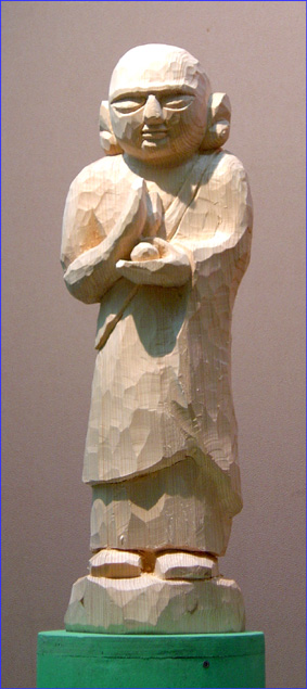 9月18日釈尊十大弟子九人目の粗彫りを始めました。富楼那(フルナ)です。意地悪な連中に、棒で叩かれたり小石を投げつけられたりしたことがありました。そのとき富楼那はいいました。「小石を投げつけただけで、刀で斬りつけて来なかった。あの人たちはいい人なんだ。」と・・・・・そんな風に思える人がいるのでしょうか?掌に投げつけられた小石を宝珠のようにのせているポーズにしました。この作品は他の八人とはちがい粗彫りから完成まで一気に進めました。
