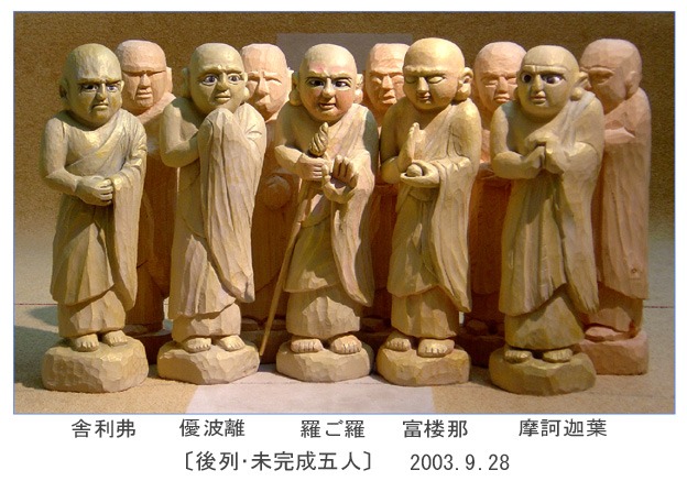 宏の番組で「最後の晩餐」というのが放送されます。有名人を招いて対談したあと、「最後の食事では何を食べたいですか?」と聞く番組です。食事をする気力が残っているのでしたら、私は最後の1日で「地蔵さん」を彫り上げたいと思います。そばに野菜の糠漬けと熱いお茶をおいて、それをつまみながら1日で「地蔵さん」を彫っておきたいのです。軟弱な男に出来るとは思いませんが夢です。今回の十大弟子の制作は、どう急いでも三日間かかってしまいます。ノミ数少なく、それでいて決定的な形が表現が出来なくては1日では完成しません。その日のために簡潔な表現が出来るよう精進しています。