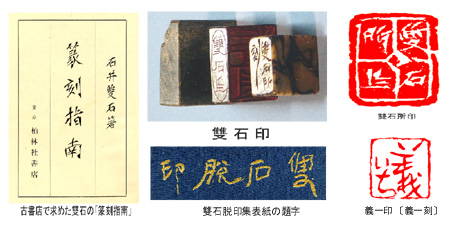 30年ほど前になるでしょうか、古書店で「篆刻指南・石井雙石著」という本が目にとまりました。「テンコクって何だ。」と、500円で買い求めました。「何だ。たかが印を彫ることか!」と、始めました。これが何と手に負えない、奥の深いものでした。その後、古物店に木鉢に山積みにされた印材がありました。どれも皆、刻字されたものばかりです。みると側面に「雙石所作」と落款彫りのあるのが三個もあるのです。こちらで値を付け1000円でゲット。脱印した「雙石所作」がその一つです。友人にこれを自慢しましたら、「雙石の脱印集を持っている。あげよう。」と、これもゲット。以来、「雙石作品」を参考に、暇を見つけては作品作りをしています。雙石は篆刻の神様です。とてもとても才能のない私など片手間に出来るものではありません。