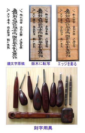 神社やお寺さんから頂く「お札」は木版画刷りでした。近年、手刷りの「お札」を頂くことは少なく、殆どが機械印刷された「お札」になってしまいました。近くのお寺さんの若住職さんは、今でも「お札」を木版手刷りしています。「正月、檀家さんにお配りするお札くらいは、一枚一枚心をこめて手刷りしなくては・・・・」といいます。何十年も使われてきた版木が摩滅してしまったので、新しい版を作ることになりました。はじめに、鏡文字の原稿を作り版木に転写します。次に、文字のエッジを彫り取ります。切り出し形の刀一本の作業です。筆勢を失わないように一気に切り取るよう心掛けました。(版木25.5cm×9.5cm)