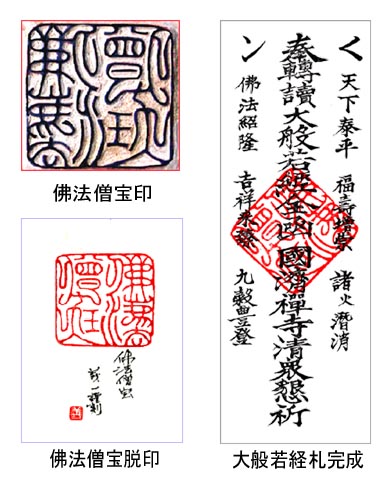「お札」には朱の社寺印が押されています。このお寺さんの「お札」には、三宝印「佛・法・僧・宝」が押されます。昔から使われてきた「三宝印」の印影をもとに字形を作りました。プリントしやすいように「お札」と同じ大きさの板に位置を決め、印を彫りました。右の写真が刷り上がった「お札」です。これはまだ単なる作品に過ぎませんが、これから若住職さんが一枚一枚丹念にプリントした後、お経を上げて頂いて完成です。