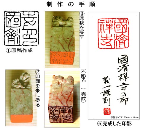 寺の「お札」や「三宝印」の制作の合間に、寺印の下書きをしてみました。良い配置の字配りに出来たので彫ったのが、この「国済禅寺」印です。私の作印の手順は次のようにします。@原稿を作ります。以前はトレシングペーパーに書いて裏返しにして鏡字に書き換えていました。パソコンを使うようになってからは、反転して原稿にしています。A印面を朱に塗ります。彫りの作業に入ったとき刀跡がよく確認できるためです。B印面に文字を写します。版面を黒塗りして、朱で文字を書き入れる方法が一般的のようですが、私は反対の色遣いにしています。C彫ります。文字のエッジを付けるのは書を書くように一気に彫ります。D脱印します。朱泥の表面を整え、印面にやさしく付けるようにします。事務用の朱肉は油分が多く、石の印には適しません。綺麗な脱印をするためには朱泥を使い、少しの練習が必要です。