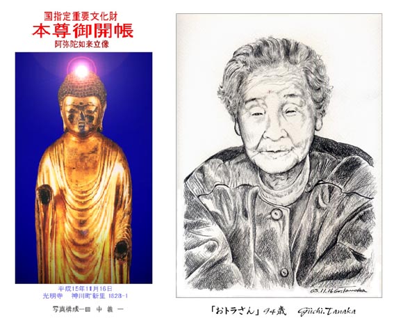 先日、近くの光明寺さんの御開帳で国指定重要文化財・阿弥陀如来像を拝むことが出来ました。稚児行列が始まるまでのあいだ、初対面の高橋さん宅で昼食をご馳走になりました。そこでお会いしたのが「高橋トラさん」です。94歳、ビックリです。かくしゃくとした姿勢で、光明寺のこと・阿弥陀さんの歴史など、歯切れ良く話してくれるのです。阿弥陀さんと、アミダサンのようなトラさんに会えていい一日でした。トラさんの肖像画、本人に気に入ってもらえるかナ。