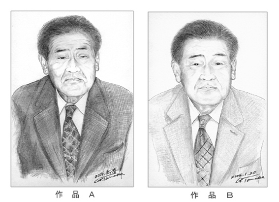 U氏は年に2.3度の会議の席でお会いする方です。会の代表として挨拶をします。挨拶を聞きながら、授業にあきた子が落書きをするようにメモ帳に表情を描いておきました。これをもとに、この2作を描きました。作品Aは5・6歳若めに、作品Bは15・6歳若く描いてみました。U氏が15・6年前どんな風貌をしていたか知りませんが、今度お会いしたとき似ているかどうか確かめてみます。