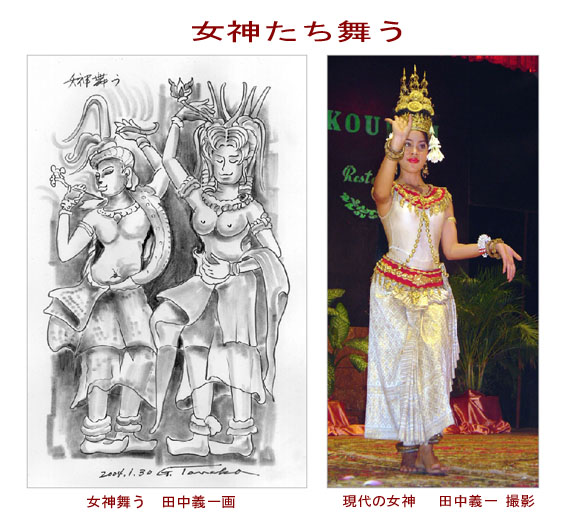 夕食のパーティーにはカンボジアの現代の女神たちの舞踊が披露されます。これにも期待をもって来たのですが、何故か感動が得られませんでした。アンコール・ワット、アンコール・トムの寺院に刻まれた女神たちの強烈な印象のためでしょう。仲間たちより一歩早めに行動して、スケッチしました。帰国後の整理も旅の楽しみの一つです。しばらく、アンコールにお付き合いください。