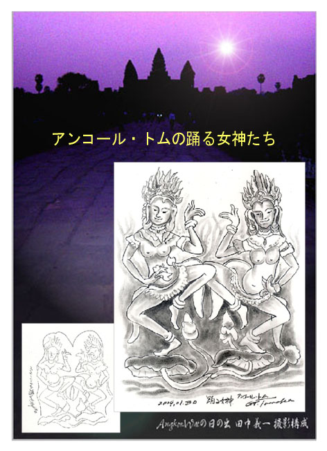アンコール・トムには、トレードマークのように柱や壁面に「踊る女神像」ののレリーフがあります。持ち歩いたスケッチブックはサムホールの小さいものです。右下のように2.3分でスケッチしたものを帰宅後仕上げました。2月31日4時起きしてアンコール・ワットの日の出を見に行きました。あいにく薄曇りのために、澄んだ日の出が見られませんでした。壁紙に使ってある写真は、昼間撮ってあった写真に手を加えて「アンコール・ワットの日の出」を作ってみました。
