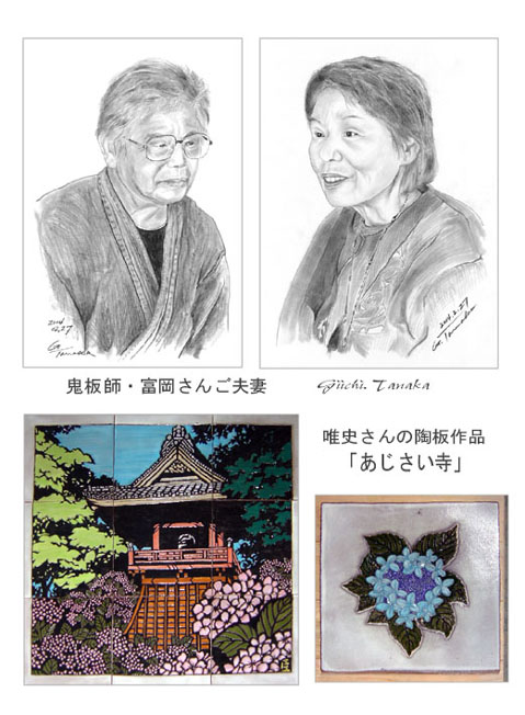 鬼瓦職人を鬼板師と呼びます。近くの小川町に鬼板師の名工が居ります。富岡さんです。親子で鬼瓦を作っています。息子さんの唯史さんから、「寺の通路を飾る陶板が完成したので見に来てください。」と連絡がありました。びっくり。唯史さんは陶板制作に携わるのは初めてです。一つの技術を極めた方は、分野の違ったものへ挑戦しても、優れた作品を完成出来るものです。両親の肖像を描かせてもらいました。唯史さんのお母さんは山野草の研究で知られた方です。