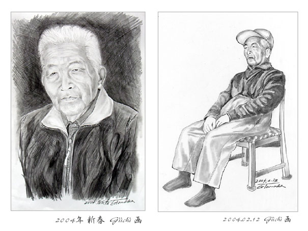 叔父松五郎の生命力には驚かされます。左の肖像画は正月に描いたものです。それから一ヶ月余り経って突然元気を失いました。体力的にも、精神的にも極端に衰えたのです。話しかけても反応が鈍く、ボーッとしてしまったのです。愕然としました。そのとき描いたのが右側です。ところが、一週間過ぎてみると庭の除草をしているのです。何という生命力なのでしょう。96歳6ヶ月です。