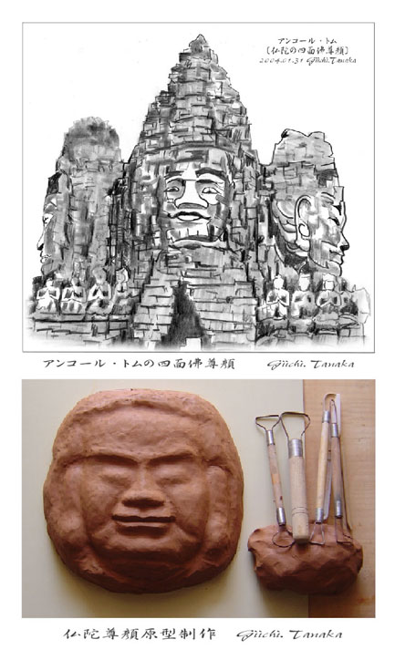 アンコール・トムの中心寺院バイヨンには、どの塔にも仏陀の四面佛尊顔が刻まれています。静かに笑みを浮かべ東西南北をお守りしているのです。佛尊顔を作り四方八方に飾り付けたら、信仰心のうすい者でもお守りしてくれるかも知れません。焼き物の佛尊顔を作ることにしました。バイヨンの仏陀にこだわらず私の仏陀を作ります。およその形が現れたら、やや硬くなるのを待って仕上げをします。