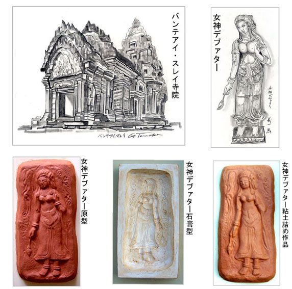 バンテアイ・スレイ寺院には、東洋のモナリザと評される女神・デブァター像があります。焼き物のデブァーター像を作ります。@スケッチをもとに粘土で像の原型を作る。A枠を作り、石膏を流し込む。B石膏型に粘土を詰め取り出す。この方法で原型と同じのデブァター像が、数多く作れるのです。石膏抜きしたものを一週間くらい乾燥させ素焼きをし、着色して完成です。