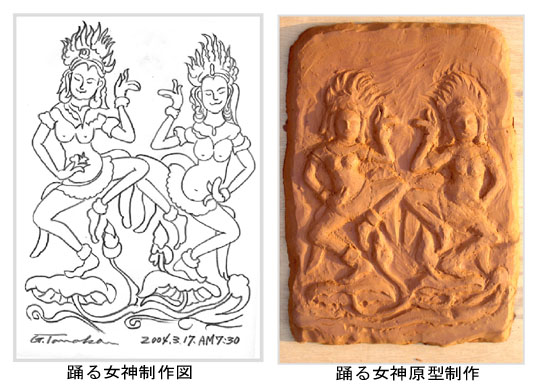 以前ご覧頂いたアンコール・トムの「踊る女神像」をレリーフにします。@スケッチをもとに下図を描きます。A次に厚さ2.5cmくらいの粘土の板を作り図を写し取ります。B写し取った図に粘土を盛りレリーフ状にします。掲示した写真はBまでの作業です。一日乾燥させやや粘土が固くなってから、細かい部分を仕上げます。次回は完成した原型と石膏取りを紹介します。