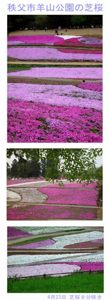 秩父市郊外の羊山公園「シバザクラの丘」には、毎日県内外から大勢の行楽客が訪れています。面積約1万2千平方メートルにモスレット種など9種類がびっしりと植えられています。何とも見事です。シバザクラは花期の永い植物です。連休明けまで楽しめます。お休みには新緑の埼玉にお出で下さい。
