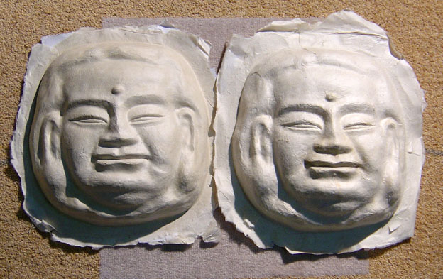 石膏型に和紙を張り重ねて成形することにはまっています。この型は26cm×24cmの大きさなので、しっかりした和紙でないと完成後強度のある張り子になりません。幸い昔からの知人に細川紙作りの名人がおります。国定無形文化財に指定されている久保昌太郎氏です。久保さんにお願いしましたら、成形に適した楮紙を作ってくれました。4枚重ねで紙とは思えない強度と、和紙の持つ暖かみのある作品になりました。