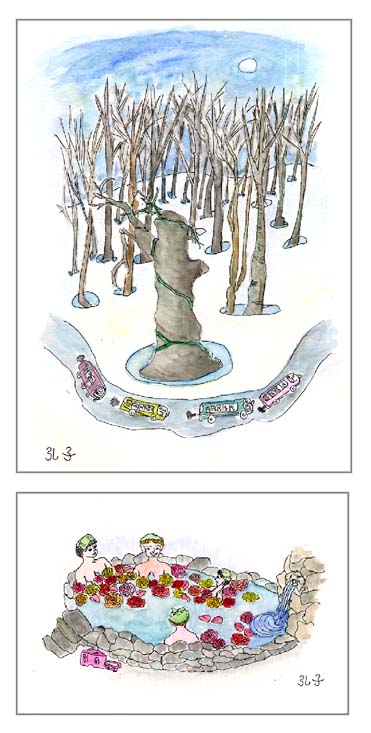 作者は友人グループ「美女軍団」で年に3.4回旅をしています。5月の連休には弘前城の桜を楽しみ、八幡平の残雪に感激して帰りました。「八幡平は残雪があり、木々の根本に雪解け穴が出来美しかった。自然の造形物にはかなわない。」と言いながらも旅行記を描いていました。