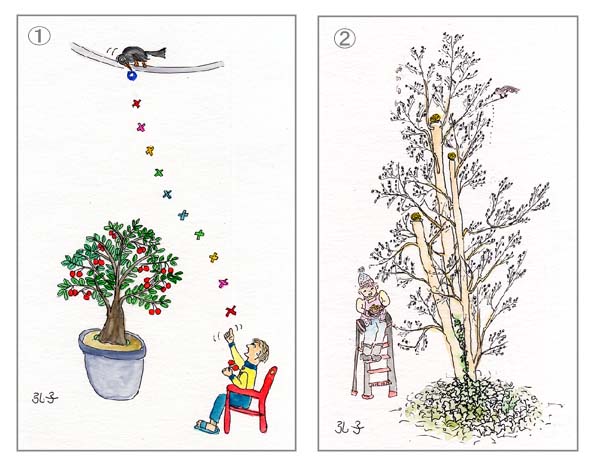 仕事場に閉じこもってばかりいないで、時折庭を散策して回ります。私がイタズラしている様子を見て作者が描きました。@の絵をご覧になって、ストーリーを作ってみてください。お寄せ頂いたストーリーの中で一番現実に合っているものに、作者の小品をお贈りいたします。