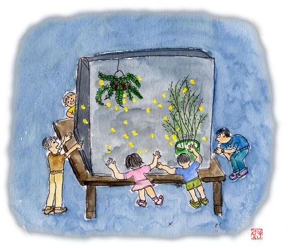 「土蔵の中に蛍を放って見学会をひらきます」と言うふれ込みで蛍を見る会が開かれました。蔵の中に田圃のあぜ道のような雰囲気をを作り、その中に蛍がが放されている情景を思い浮かべながら行ってみました。ところが2メートルくらいの木枠に蚊帳を張った囲いの中に、20数匹の蛍が飛んでいました。それでも子どもたちは歓声を上げていました。これでいいのかな?これで!!! 弘子展最終回です。夏休みをしていた私、そろそろ行動を開始します。