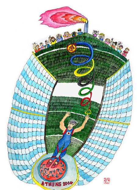 ゴメンナサイ。アテネ五輪テレビ観戦のため昼夜が逆転してしまいました。約束した自在鉤作りが遅れています。取りあえず本日は女房の作品を見て下さい。室伏広治のハンマー投げ予選です。室伏は20日予選で、予選通過記録79mを一投目でクリアし決勝に進出しました。予選終了後、優勝を信じて描いた絵です。中央の長方形白紙の部分は記録を書き込むのだに残してあります。決勝が22日行われ、室伏は6投目に82.91mをマークし銀メダルを獲得しました。チョット残念。