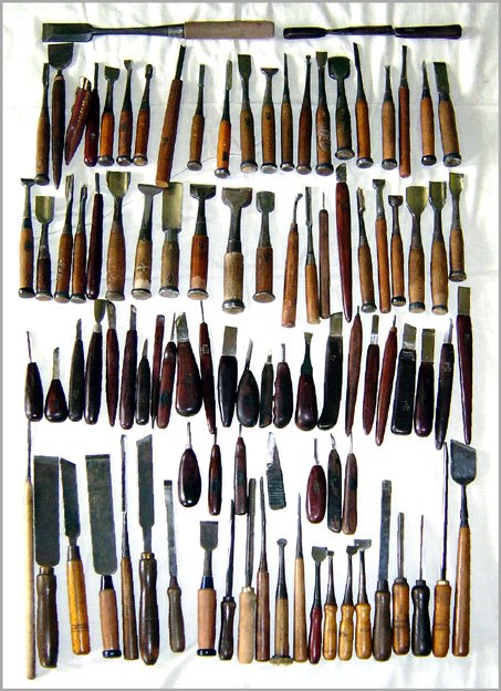 「彫刻にはどんな刃物をお使いですか。見せてください。」という要望がありました。ご覧ください。「刃物を見るとその人の技量がわかる」と言われています。念入りに手入れをしているつもりでも、よく見るとずさんな研ぎ方のものが目に付きます。数日かけて研ぎなおし、他人に見られても恥ずかしくない道具に仕上げようと思います。