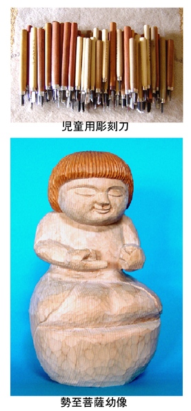 棟方志功は版画制作に子ども用の彫刻刀を使っていたそうです。私も使い古した子ども用の彫刻刀を数十本持っています。研ぎ方次第で良くきれるものです。セットで購入した彫刻刀には小さな合成砥がついています。この砥石で研ぐときれなくなるばかりです。軟らかめの天然砥を使うことがよいでしょう。よく研ぎ上げた子ども用彫刻刀だけを使って「勢至菩薩幼像」を彫り始めました。