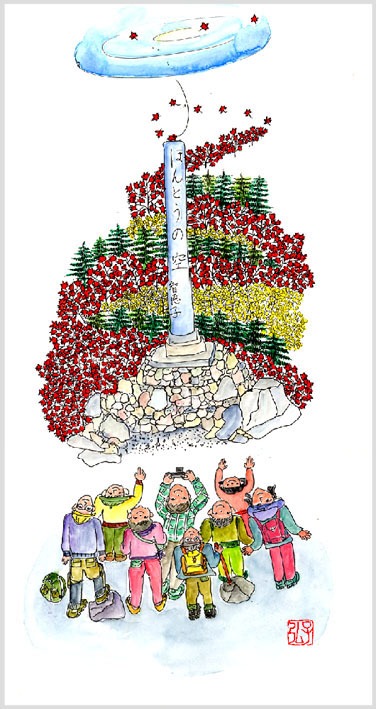 待ちに待った紅葉のシーズンなのに 彫刻の仕事が忙しくて出かけられません。代わりに女房殿に見に行かせました。磐梯の五色沼・猪苗代湖・安達太良山の紅葉です。「とちもち」をぶらさげて 感激して帰って来ました。「ほんとだ 安達太良山には ほんとうの空とほんとうの紅葉がありました。」と描いた絵です。