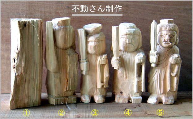 身長20cm余りの不動さんを作り始めました。素材はヒノキを薪割りしたものです。無造作に割った材料ですから不定形です。不定形の材料を使うので 同じ手順で作っても 皆違った形に仕上がります。五体を同時に作ります。手順がわかるように 素材@からほぼ完成のDまで 並べて写真にしました。参考にしてください。 この程度の作品なら 一日一体の作品が完成します。