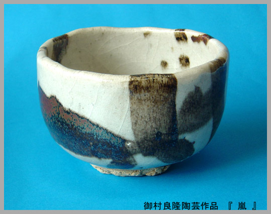 御村良隆氏の陶芸作品をみたい との要望が多いご覧頂こう。「茶は静寂の中で 楽しむものだが あえて 『嵐』 のような絵柄にした。静にして動を忘れず 動にして静を忘れず そんな気分だ。」と御村氏は言う。