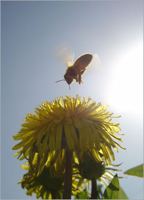 澄んだ空に朝日がさす。タンポポが開きはじめる。それに向かって 働き者のミツバチが一直線に飛び込んでくる。そんな場面を撮りたいものだ。 と 思っていた。願ってみるものだ。AM9:15最初のシャッターに願った通りの場面が飛び込んだ。