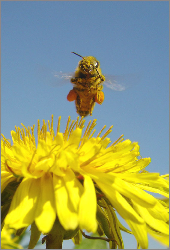 朝一番の収穫を終えて飛び立った。彼らの動体視力の良さには驚く。花の裏側から飛び立った瞬間 撮影者に気づいたのであろう。プリントをしてみると 触角を撮影者に向けている。瞬間 180度向きを変えて 澄んだ空に飛び去った。撮影者も この撮影を通して 動体視力が増したように感じられる。年を重ねても動体視力は増すものなのだろうか。動く物への反応が速くなった。