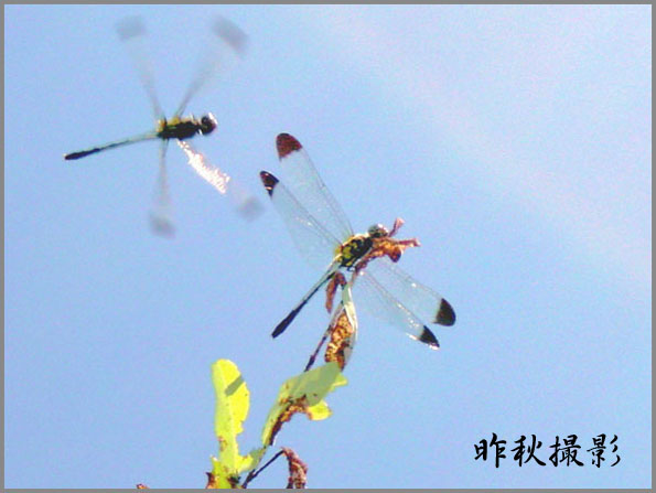 昆虫写真を撮る動機になったのが 「二匹のトンボ」作品である。複数のトンボを 一つの画面に撮り込めないものかと 我慢強くジッーとこらえていたのを思い出す。 私の作品作りは