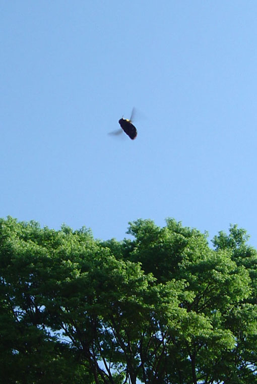 近くの花から次の花に飛び移るハチは 容易に捉えられるようになった。しかし 広い空を長距離飛行するハチをファインダーに入れることは難しい。デジカメのシャッター反応が遅いため チャンスはあっても逃してしまう。庭の真ん中に長椅子を出し寝ころんで待つこと20分 ケヤキの上を飛ぶハチをゲットした。