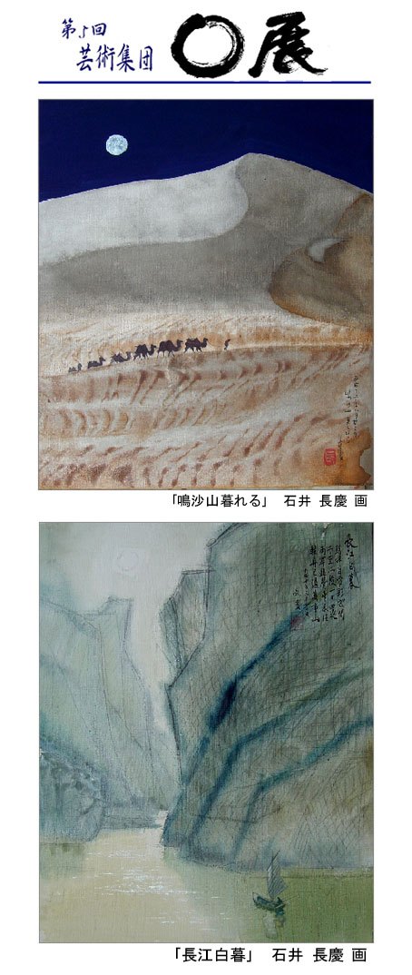 書家・刻字家・篆刻家・画家・鎧師等肩書きを持つ長慶氏は 今回のグループ展には絵画を展示します。「先輩の絵描きさんに失礼でしょうが 今回は絵を出品させてください。夜なべ仕事に遊びで描いたものです。旅をしたときの絵日記ですね。鳴沙山暮れるは砂漠の砂を使って描きました。敦煌莫高窟夕映の空は敦煌の砂でマチエールを作りました。」 と 長慶氏はいう。何という拘りでしょう。この卓越した技とセンスに脱帽です。