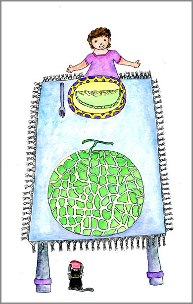 知人からお中元が届いた。好物の「夕張メロン」だ。生産者カードには‘3・4日後が食べ頃’と記されていたが 我慢できない。すぐにいただくことにした。「マンゾク 満足」。女房殿お礼のハガキを描いた。「オイシソウ! ニャン子ニモ チヨウダイ!」 と書き添えた。
