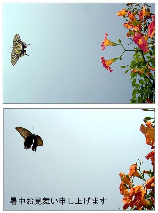 関東地方も梅雨が明けたらしい。久しぶりの青空に ノウゼンカズラが映える。昆虫も活動をはじめた。揚羽二題を暑中見舞いに送る。