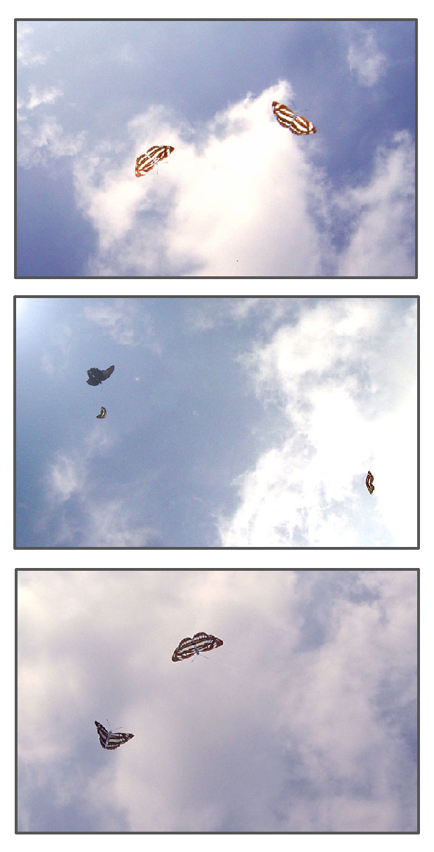 ミスジのなかま?コミスジと思われる このカップルはたえず寄り添って飛ぶ。どの世界にも意地悪者がいるが このカップルにいつも横恋慕するのが 黒揚羽のオバサンである。二羽の間に割って入る。コミスジは一瞬 間を取るが すぐに寄り添う。なんとも微笑ましい。