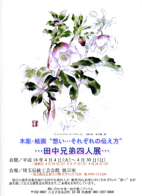 子どもの頃の体験は何時かの時期には目覚めるものです。私たち兄弟は花の生産農家に生まれました。春を迎えると家の周りの畑は 福寿草・チュウリップ・アネモネ・水仙などに彩られます。弟健二はイラストレーターの仕事に就きました。筆・墨・絵の具を扱うのはプロです。この技と子どもの頃の体験がうまく合致して 今では「花の画家」といわれるようになりました。ものずきな田中一族の中でも 「クリスマスローズ」のような表現が出来るのは彼一人です。