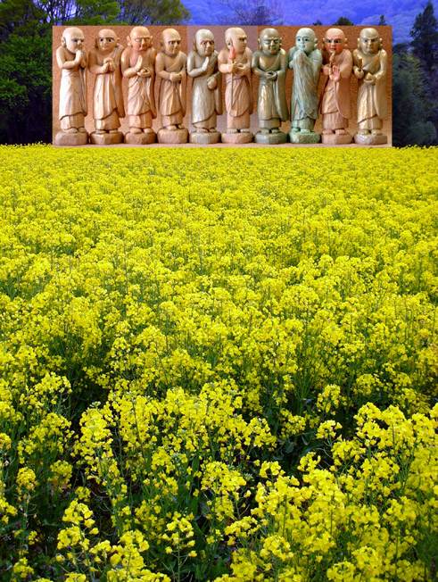 菜の花畑に十大弟子 〔木彫・義一作〕