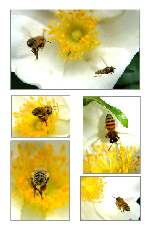 冴えない日が続いた。ミツバチの活動もにぶい。空気が乾いた少しの時にシャッターを切った。ここ数日で開きはじめたバラの花に 数匹が飛んだ。少ないチャンスを逃さす撮った。まだまだ満足のいく作品になっていない。爽やかな日が待ち遠しい。